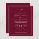 Einfache, preiswerte Hochzeitseinladung mit modernem und elegantem Design mit zwei Buchstaben Monogramm oben, einem kühnen Datumslayout und Ihren Details, umgeben von einer dünnen Grenze. Alle Designelemente sind auf bordeauxrotem Hintergrund weiß und können im Entwurfsbearbeitungstool geändert werden. Ein elegantes und stilvolles Design, das sich ideal für ein minimalistisches Paar eignet.