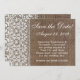 Einfache Einladung und Spitze Ankündigung Datum freihalten einladenden Flachkarten. Das Naturthema ist ideal für eine rustikale Hochzeit im Freien oder auf dem Land. Textural, grob-Look Bild von Burlap kontrastiert die sanfte elegante Spitze. Copyright © www.CustomInvitesOnline.com