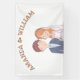 Dieses Hochzeitsbanner zeigt eine bezaubernde Abbildung einer Braut und eines Bräutigams. Der Bräutigam ist mit kurzem braunem Haar, einem hellen Teint dargestellt und trägt eine marineblaue Anzug-Jacke über einem hellblauen Shirt und einer weißen Krawatte. Er hat einen kleinen Boutonniere, der auf seinen Laptop fixiert ist. Die Braut ist neben ihm stehend und lächelt süß. Sie hat schwere, rötlich-orangefarbene Haare mit einer Blume aus rosa, orangefarbenen und weißen Blüten. Hinter ihr fließt ein zarter weißer Schleier. Sie trägt ein weißes Hochzeitskleid mit einem süßen Halsband und einer Perlenhalskette. Diese einfache, Cartoon-ähnliche Abbildung weist auf eine String-liebende Verbindung zwischen ihnen hin. Es ist skurril und liebenswert und setzt einen fröhlichen Ton für die kommende Hochzeit.