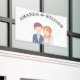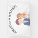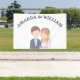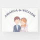 Dieses Hochzeitsbanner zeigt eine bezaubernde Abbildung einer Braut und eines Bräutigams. Der Bräutigam ist mit kurzem braunem Haar, einem hellen Teint dargestellt und trägt eine marineblaue Anzug-Jacke über einem hellblauen Shirt und einer weißen Krawatte. Er hat einen kleinen Boutonniere, der auf seinen Laptop fixiert ist. Die Braut ist neben ihm stehend und lächelt süß. Sie hat schwere, rötlich-orangefarbene Haare mit einer Blume aus rosa, orangefarbenen und weißen Blüten. Hinter ihr fließt ein zarter weißer Schleier. Sie trägt ein weißes Hochzeitskleid mit einem süßen Halsband und einer Perlenhalskette. Diese einfache, Cartoon-ähnliche Abbildung weist auf eine String-liebende Verbindung zwischen ihnen hin. Es ist skurril und liebenswert und setzt einen fröhlichen Ton für die kommende Hochzeit.