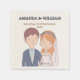 Diese Hochzeitszettel zeigen eine charmante Abbildung einer Braut und eines Bräutigams. Der Bräutigam ist mit kurzem braunem Haar, einem hellen Teint dargestellt und trägt eine marineblaue Anzug-Jacke über einem hellblauen Shirt und einer weißen Krawatte. Er hat einen kleinen Boutonniere, der auf seinen Laptop fixiert ist. Die Braut ist neben ihm stehend und lächelt süß. Sie hat schwere, rötlich-orangefarbene Haare mit einer Blume aus rosa, orangefarbenen und weißen Blüten. Hinter ihr fließt ein zarter weißer Schleier. Sie trägt ein weißes Hochzeitskleid mit einem süßen Halsband und einer Perlenhalskette. Diese einfache, Cartoon-ähnliche Abbildung weist auf eine String-liebende Verbindung zwischen ihnen hin. Es ist skurril und liebenswert und setzt einen fröhlichen Ton für die kommende Hochzeit.