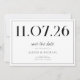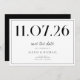 Eine schlichte, moderne Save the Date Karte. Personalisieren Sie dieses elegante schwarz-weiße Design, um Ihre Hochzeit Datum, Namen und Details.