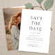 Diese klassische und dennoch moderne Save the Date-Karte zeichnet sich durch einen schicken, weißen Hintergrund mit eleganter schwarzer Typografie aus. Auf der Rückseite befindet sich ein "Vollblut"-Foto. Es ist das perfekte Design für eine elegante und dennoch minimalistische Hochzeit! Informationen zur Koordination von Elementen finden Sie in der Auflistung.