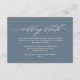 Einfache und schicke, dustig blaue und weiße Hochzeitsgast-Details mit eleganter Kalligraphie-Schrift.