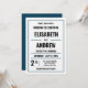 Einfache moderne Hochzeitseinladung. Kühl, schwarz und weiß. Blauer Grenzakzent und Rückseite der Einladung.