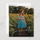 Dieses moderne, elegante Foto Abschluss Einladungs-Combi bietet ein Script-Graduate-Overlay und individuell anpassbaren Namen, Schule und Foto an der Vorderseite. Die Rückseite bietet Glückwünsche und Veranstaltungsdetails mit weiteren 2 Fotos. Eine tolle Art, Ihren Absolventen zu präsentieren.