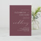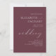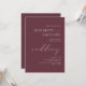 Diese einfache, elegante Einladung enthält das Wort "Hochzeit" in einem stilvollen weißen Skript. Personalisieren Sie sie mit den Namen der Braut und des Bräutigams in weißen Serif-Hauptstädte (verbunden mit dem Wort "und" im Skript, das "Hochzeit") und den restlichen Text in Kleinbuchstaben weiß kursiv auf einem burgundischen Hintergrund.