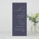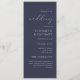 Dieses einfache, elegante Hochzeitsprogramm zeigt weißen Text, der auf einem dunkelmarineblau blauen Hintergrund am rechten Rand ausgerichtet ist. Das Wort "Hochzeit" erscheint in weißer handgeschriebener Kalligrafie, der Rest in Serif und kursiven Schriftart.