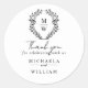 Fügen Sie Ihrer Hochzeit oder einem besonderen Ereignis eine Touch zeitloser Eleganz hinzu. Dieses klassische Schwarz-Weiß-Layout mit minimalistischem botanischem Kranz-Monogramm verbindet zarte Blumendetails mit edler Typografie für einen eleganten und modernen Look. Das anmutige, handgeschriebene Drehbuch, gepaart mit fetten Serif-Schriftart, schafft ein harmonisches und stilvolles Design, das Dankbarkeit perfekt zum Ausdruck bringt. Diese vielseitig einsetzbaren Aufkleber mit vollständig anpassbarem Text eignen sich ideal zum Versiegeln von Umschlägen, Dekorieren von Gefälligkeiten oder Hinzufügen einer persönlichen Touch zu Ihrem Veranstaltungspapier und machen sie zu einem unvergesslichen Bestandteil Ihres Festes.