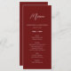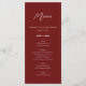 Diese moderne, minimalistische Hochzeit im Herbst Empfang-Karte bietet eine einfache, saubere Anordnung auf bordeauxrotem Hintergrund. Das Design bietet Platz für Sie, um Ihre Hochzeitsempfang-Menüpunkte, die Namen der Braut und Bräutigam und deren Hochzeitsdatum hinzuzufügen.
