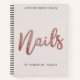 Elegantes und einfaches Termin-Notebook für Ihr Nails-Geschäft, mit Rose Gold-Folie-Skript, auf einem Bubble-Gummi-Hintergrund mit Ihrem Namen in schwarz Farbe . Fügen Sie Ihre Daten auf der Rückseite des Notebooks hinzu oder löschen Sie Text.