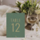 Elegante, grüne und goldene minimalistische Hochzeitsvorlage Tischnummer. Das einzigartige und moderne smaragdgrüne Design eines Eukalyptusblattes in Gold und Salbei. Und goldgelbe Tischnummer auf einem extravaganten grünen Hintergrund. Nehmen Sie sich diese moderne kalligraphische Hochzeitskalligraphie-Tischnummer und passen Sie sie an.