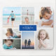 Foto Mousepad, wo Sie acht eigene Fotos in einer minimalistischen Collage hinzufügen können. In der Mitte, vor einem blauen Hintergrund, fügen Sie Ihren Familiennamen und Initial.