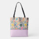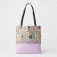 Diese einfachen, modernen Folklorekunst-Blume in aquamarin, gelb, blau, rosa und orange eignen sich perfekt für eine vollwertige Tasche aus Printmedien. Das untere Drittel (ca. 10 cm) ist ein koordinierender Feststoff mit einem dünnen Streifen. Tragetaschen sind ein lustiges saisonales ästhetisches Accessoire. AI unterstützte Grafik, die mit kommerziellem Einsatz erworben wurde. Kunstwerk: CosmicMeta