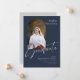 Diese 5" x 7" Abschluss-Ankündigung verfügt über ein bogenförmiges Foto auf marineblarem Hintergrund mit hellgrauem Schriftzeichen. Zu den Teilnehmern zählen der Name des Absolventen, die Uni oder der Universitätsname, der Grad, der Schwerpunkt des Abschlusses und eine zusätzliche Zeile für weitere Informationen wie z.B. Sonderehren.