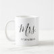 Einfache Kaffee-Tasse mit "Mrs." in einem eleganten Skript zusammen mit Ihrem Nachnamen in schwarz auf weißem Hintergrund. Diese moderne Kaffeemaschine Tasse ist ein großartiges Hochzeitsgeschenk für eine Braut.