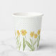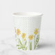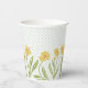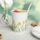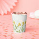 Lassen Sie sich im Frühling und Sommer von diesem bezaubernden Papier-Cup-Design verzaubern, das malerisch illustrierte wilde Blume mit grünen Stielen und Blätter vor einem subtilen Hintergrund aus cremefarbenem Weiß mit einem Muster aus blassblauen Polka-Punkten bietet.
