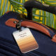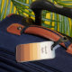 Minimalistisch gestreiftes Gepäckstück in Orange- und Brauntönen, blau akzentuiert. Sie können es personalisieren, indem Sie den Namen ändern.