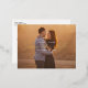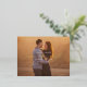 Dieses elegant minimalistische Foto Save the Date verfügt über ein lässiges Drehbuch und ein großes Foto. Auf der Vorderseite der Postkarte steht "Save the Date" in einfacher Goldfolienkalligraphie. Der Name des Paares ist in Weiß über dem Skript geschrieben, und das Hochzeitdatum und der Ort werden unter dem Skript geschrieben. Das Typografie-Design überlagert ein vollblutförmiges horizontales Foto (Querrichtung). Zusätzliche Hochzeitsdetails (einschließlich der Hochzeitswebsite) können auf der Rückseite der Postkarte hinzugefügt werden.