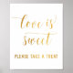 Elegante Gold Kalligraphie Liebe ist Sweet Bitte nehmen Sie eine Leckerei Gastgeschenken Unterschreiben Diese einfache goldkalligraphische Liebe ist süße Zeichen ist ideal für eine einfache Hochzeit, Brautparty, Geburtstag oder jedes andere Gastgeschenk Zeichen. Dieses neutrale Design zeichnet sich durch ein minimalistisches Schild aus, das mit einer Schrift aus Goldfolie geschmückt ist. Dieses elegante Schild kann für eine Hochzeit oder jedes Party oder jede Veranstaltung verwendet werden. Bitte beachten Sie, dass dieses Design keine echte Goldfolie enthält. Es handelt sich um eine hochwertige Grafik, die wie Goldfolie aussieht.