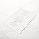 Einfache Gold Foil Blätter Hochzeitsfoil Einladung. Diese elegante und stilvolle Hochzeitseinladung besticht durch schlichte Texte und wunderschöne Blätter, die in Goldfolie gedruckt sind.