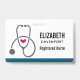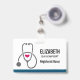 Personalisiertes Abzeichen mit einer Abbildung einer grauen Stethoskop-Silhouette mit niedlichem rotem Herz.