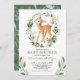 Elegante Babydusche mit ansprechender Aquarellbilderin eines süßen Hirsches und einer modernen botanischen Vegetation in Grün und Gold. Die Textfelder sind vollständig editierbar. Sie können die Formulierung ändern, um Ihre Veranstaltung zu Anzug zu bringen, z.B. Geburtstag, Babydusche / Sprinkle, Taufe, Taufen, Namenstag, etc.