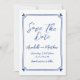 Einfache Hand gezeichnet Whimsical Blue Wedding speichern Sie das Datum. Die Inspirierte Blue and White Save the Date Card ist ein puristisches, minimalistisches Design, das sich perfekt für Paare eignet, die zeitlose Eleganz suchen. Ein subtiler, handgezeichneter Rahmen mit zauberhaften blauen Herzen in jeder Ecke umkreist Ihre Hochzeitsdetails sanft, präsentiert in einer Mischung aus Drehbuch und handgeschriebenen Schriftart für ein stilvolles und persönliches Aussehen. Auf der Rückseite befindet sich ein individuelles Monogramm der Initialen des Paares, das eine durchdachte und raffinierte Touch hinzufügt. Inspiriert durch klassische europäische Ästhetik mit italienischen und französischen Einflüssen, ist dieses Design vollständig an Ihr Hochzeitsthema angepasst. Ob digital gedruckt oder gemeinsam genutzt, es bietet eine ausgeklügelte und spielerische Möglichkeit, Ihren besonderen Tag zu verkünden.
