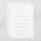Einfache Einladung zum Hochzeitsfeiern mit modernem und elegantem Design, oben mit zwei Buchstaben-Monogramm und in einem dünnen Rahmen. Alle Designelemente sind staubige Rose rosa über einem weißen Hintergrund und können in eine beliebige Farbe des Designbearbeitungstools umgewandelt werden. Die Rückseite hat alle Ihre Hochzeitsdetails, sodass die Notwendigkeit einer separaten Kapselkarte, sodass dieses eine preisgünstige Hochzeitssuite. Ein elegantes und stilvolles Design, das sich ideal für ein minimalistisches Paar eignet.