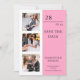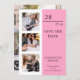 Simple Wedding Save The Date Foto Picture Invitations beinhaltet vier Ihrer Lieblings-Fotos, drei auf der Vorderseite und eines auf der Rückseite mit dem Text "Save the Date" in eleganter, moderner Schrift Typografie auf einem rosa und weißen Hintergrund. Einfach, modern und elegant für Ihre Hochzeitsfeier. Entworfen von ©Evco Studio www.zazzle.com/store/evcostudio