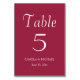 Begleiten Sie Ihre Hochzeitsgäste mit dieser schlichten Tischnummer-Karte, die mit weißen, stilisierten Schriftzeichen auf einem trendigen, weinroten Hintergrund gestaltet ist. Design ist auf jeder Seite der Karte. Bearbeiten Sie Ihre Karte, um die Tischnummer, die Namen und das Datum des Ehepaares zu ändern. Bestellen Sie Karten für jede Tischnummer separat.