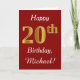Dieses schlichte Design der Geburtstagskarte zeigt die Meldung "Happy 20 th Birthday", die "20." hat ein goldenes Aussehen in den Imitaten. Es enthält auch einen benutzerdefinierten Namen und einen dunkelroten Hintergrund. Es könnte jemandem gegeben werden, der seinen zwanzigsten Geburtstag feiert.