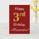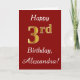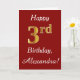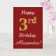 Dieses schlichte Design der Geburtstagskarte zeigt die Meldung "Happy 3. Geburtstag", die "3." hat ein goldenes Aussehen in den Imitaten. Es gibt auch einen individuelle Name und einen dunkelroten Hintergrund. Es könnte jemandem gegeben werden, der seinen dritten Geburtstag feiert.