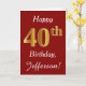 Dieses schlichte Design der Geburtstagskarte zeigt die Meldung "Happy 40 th Birthday", die "40." hat ein goldenes Aussehen in den Imitaten. Es hat auch einen personalisierten Namen und einen dunkelroten Hintergrund. Es könnte jemandem gegeben werden, der seinen vierzigsten Geburtstag feiert.