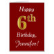 Dieses schlichte Design der Geburtstagskarte zeigt die Meldung "Happy 6th Birthday", die "6th" hat ein goldenes Aussehen in Imitate. Es enthält auch einen benutzerdefinierten Namen und einen dunkelroten Hintergrund. Es könnte jemandem gegeben werden, der seinen sechsten Geburtstag feiert.