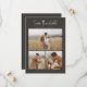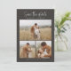 Einfache Kalligrafie Script Modern Vier Foto Save the Date mit einem Trio von Fotos auf der Vorderseite, zusammen mit modernen, minimalen Typ. Ein Single großes Foto auf der Rückseite, mit Ihrer Hochzeitswebsite.