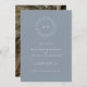 Einfaches Classic Dusty Blue Leafy Wildblume Wappen Save the Date - Einfache und elegante leafy Wildblume botanischer Kranz ist auf diesem einfachen, aber oh so eleganten Save the Date. Auf der Rückseite der Einladung befindet sich das Lieblings-Foto des Ehepaars in voller Blende. Save the Date wird in staubblauer Farbe angezeigt, aber Sie können den Hintergrund im Designwerkzeug leicht ändern, um sich mit Ihrer Farbpalette abzustimmen.