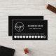 Moderne Treuekarte mit einem einfachen und minimalen Design mit Ihrem Logo, Ihrem Firmennamen und Ihrem Slogin in Weiß auf schwarzem Hintergrund. Unten finden Sie Ihr Sonderangebot mit 10 Briefmarke und einem Stern, um das Sonderangebot zu präsentieren. Sie können die Anzahl der Briefmarke im Entwurfsbearbeitungstool ändern. Der Rücken hat Ihre Kontaktdaten sowie die Geschäftsbedingungen. Ein einfaches und schlichtes Design, das immer noch so beruflich ist. Diese Treuekarte ist ideal für ein Café, Restaurant, Friseur und vieles mehr.