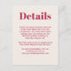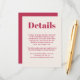 Geben Sie Ihren Hochzeitsgästen die Details, die sie für Ihre Hochzeit benötigen. Dieses trendige, minimalistische Design hat feinen Text und beliebte Farbwahl. Hier in trendigem Magenta pink mit ecru Koordinaten mit einem passenden Set von Hochzeitsartikeln und anderen Produkten für Ihren besonderen Tag oder Event. Sie können die Textvorlage mit Hotelinformationen, Fahrtrichtungen, besonderen Treffen und Begrüßungen und vielem mehr bearbeiten. Editieren Sie einfach die Textvorlage nach Wunsch. Wenn Sie den Text nach dem Anpassen mit Ihren Daten neu zentrieren müssen, können Sie ihn in die Mitte ziehen.