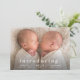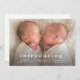 Eine einfache Minimal Twin Foto Birth Ankündigung mit modernem Typ und einem großen horizontalen Foto an der Vorderseite. Auf der Rückseite befinden sich 2 Fotos mit einem großen Namenskopf und eine persönliche Nachricht aus der Familie. Klicken Sie auf die Schaltfläche Bearbeiten, um dieses Design mit Ihren Fotos und Details anzupassen.