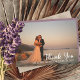 Minimalistisches Foto Hochzeit "Danke" mit einem Single großen Foto auf der Vorderseite mit Namen und Hochzeitsdatum und Ihre einzigartige Botschaft und Unterschrift auf der Rückseite. Auf der Rückseite befindet sich ein duskischer Lavendelhintergrund. Template Platzhalter Foto mit freundlicher Genehmigung Entflechten. Design von Holiday Hearts Designs.