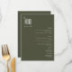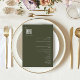 Genießen Sie Ihr Hochzeitsessen mit unserem Minimalistischen Olive Green Modern Wedding Menu. Das schicke Design mit einer angesagten Olivgrün-Farbe verleiht Ihrem Fest Eleganz. Bestellen Sie jetzt Ihre kulinarischen Köstlichkeiten auf stilvolle und moderne Art und Weise, um die Eleganz Ihres besonderen Tages zu erhöhen.