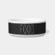 Niedliche moderne Farmhäuser-Futter-Schüssel für Hunde oder Katzen mit "Futter" in handgeschriebenem Stil, weiße Schrift auf kohlegrauem Hintergrund mit gestreiften Akzenten.