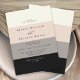 Dieses schlichte minimalistische Hochzeitsinklusivdesign mit stylischen, breiten Farbblockstreifen in Elfenbein, Rosa, Taupe und Schwarz. Der klassische Look ist geschmackvoll und elegant und ist eine wunderbare Wahl für Hochzeiten zu jeder Jahreszeit. Personalisieren Sie die Textvorlage mit Ihren Hochzeitsdetails. Wenn Sie Textzeilen hinzufügen oder entfernen möchten, wählen Sie unter "Personalisieren Sie diese Vorlage" die Option "Bearbeiten mit dem Designwerkzeug", um weitere Änderungen vorzunehmen.
