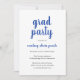 Einfache Abschlussfeier mit klassischem Design mit "grad Party" und dem Namen des Absolventen in einer dicken blauen Schrift-Handschrift auf weißem Hintergrund. Die Rückseite ist massiv blau. Eine elegante Einladung mit einem modernen minimalistischen Flair für einen Absolventen.
