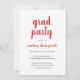 Einfache Abschlussfeier mit klassischem Design mit "grad Party" und dem Namen des Absolventen in einer dicken roten Schrift-Handschrift auf weißem Hintergrund. Die Rückseite ist massiv rot. Eine elegante Einladung mit einem modernen minimalistischen Flair für einen Absolventen.