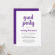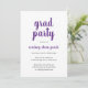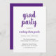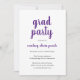 Einfache Abschlussfeier mit klassischem Design mit "grad Party" und dem Namen des Absolventen in einer lila Schrift-Handschrift auf weißem Hintergrund. Die Rückseite ist solide lila. Eine elegante Einladung mit einem modernen minimalistischen Flair für einen Absolventen.