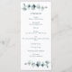 Eine schicke und moderne Programmkarte ist mit minimalistischen Eukalyptus-Zweigen gerahmt. Die Rückseite listet die Hochzeitsfeier vor einem reichen grünen Hintergrund auf.