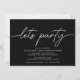 Einfache, moderne Einladungen mit der Überschrift "Let's Party" im Script. Fügen Sie unten Ihre Veranstaltungsdetails hinzu. Weißer Text auf schwarzem Hintergrund.