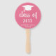 Minimalistische Abschluss-Handfans mit einem schlichten und klassischen Design mit einem Graduierkopf und einer "Jahrgangsklasse" in einer dicken Schrift, zusammen mit dem Namen des Absolventen in Weiß auf einem rosa Hintergrund. Die Hintergrundfarbe kann in eine beliebige Farbe geändert werden. Traditioneller Stil mit modernem Flair für einen Absolventen.